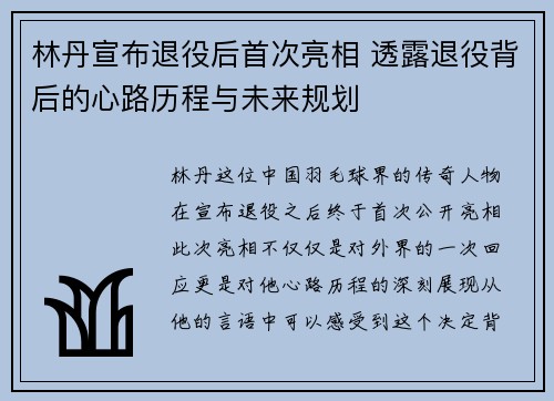 林丹,这位中国羽毛球界的传奇人物,在宣布退役之后终于首次公开亮相。此次亮相不仅仅是对外界的一次回应,更是对他心路历程的深刻展现。从他的言语中可以感受到,这个决定背后充满了沉思与反思。林丹的退役,并不是...