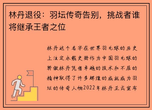 林丹,这个名字在世界羽毛球的历史上注定永载史册。作为中国羽毛球的骄傲,林丹凭借卓越的技术和不屈的精神,取得了许多辉煌的成就,成为羽坛的传奇人物。2022年,林丹正式宣布退役,这不仅意味着一个时代的结束...