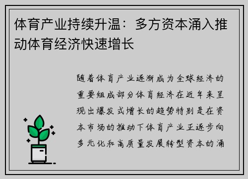 随着体育产业逐渐成为全球经济的重要组成部分,体育经济在近年来呈现出爆发式增长的趋势。特别是在资本市场的推动下,体育产业正逐步向多元化和高质量发展转型。资本的涌入无疑是这一变化的关键推动力,吸引了来自多...