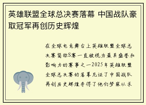 在全球电竞舞台上,英雄联盟全球总决赛(简称S赛)一直被视为最具盛誉和影响力的赛事之一。2025年,英雄联盟全球总决赛的落幕见证了中国战队再创历史辉煌,夺得了他们梦寐以求的冠军。这一胜利不仅标志着中国电...