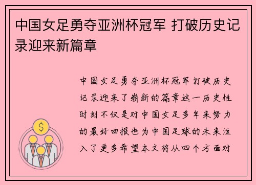 中国女足勇夺亚洲杯冠军,打破历史记录,迎来了崭新的篇章。这一历史性时刻不仅是对中国女足多年来努力的最好回报,也为中国足球的未来注入了更多希望。本文将从四个方面对中国女足夺冠的历史意义进行详细阐述。首先...