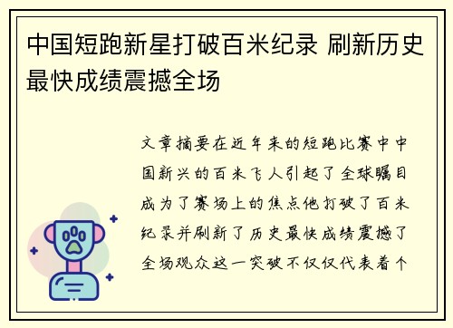文章摘要:近期,中国短跑新星以9秒83的惊人表现打破了全国纪录,再次证明了中国在短跑领域的崛起。这一突破不仅是对个人能力的极限挑战,也是中国体育事业快速发展的重要标志。文章将从四个方面详细探讨这一历史...