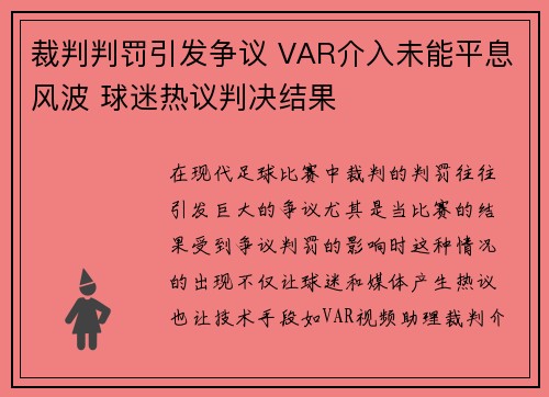• 裁判判罚引发争议 VAR介入未能平息风波 球迷热议判决结果