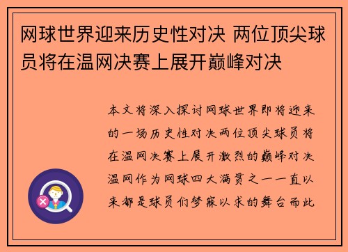 • 网球世界迎来历史性对决 两位顶尖球员将在温网决赛上展开巅峰对决