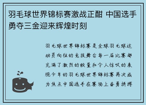 • 羽毛球世界锦标赛激战正酣 中国选手勇夺三金迎来辉煌时刻