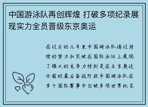 • 中国游泳队再创辉煌 打破多项纪录展现实力全员晋级东京奥运
