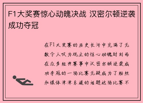 在F1大奖赛的历史长河中,充满了无数令人叹为观止的惊心动魄时刻。而在众多经典赛事中,汉密尔顿逆袭成功夺冠的一场比赛,无疑成为了粉丝和媒体津津乐道的话题。这场比赛不仅仅是一场速度与技术的较量,更是对车手...