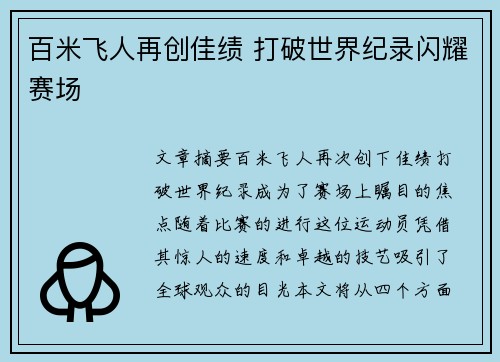 文章摘要:百米飞人再次创下佳绩,打破世界纪录,成为了赛场上瞩目的焦点。随着比赛的进行,这位运动员凭借其惊人的速度和卓越的技艺,吸引了全球观众的目光。本文将从四个方面详细探讨百米飞人如何再创佳绩并闪耀赛...