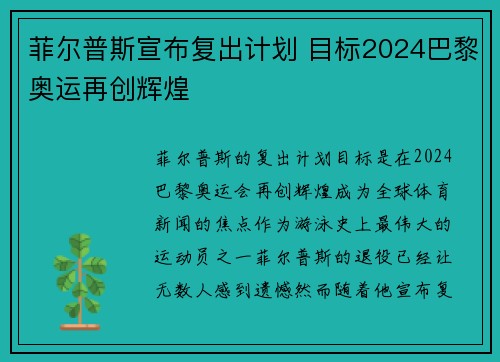 菲尔普斯的复出计划,目标是在2024巴黎奥运会再创辉煌,成为全球体育新闻的焦点。作为游泳史上最伟大的运动员之一,菲尔普斯的退役已经让无数人感到遗憾。然而,随着他宣布复出,这一切将迎来新的转机。在202...