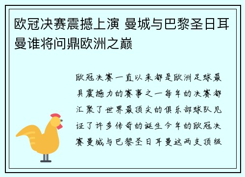 欧冠决赛一直以来都是欧洲足球最具震撼力的赛事之一,每年的决赛都汇聚了世界最顶尖的俱乐部球队,见证了许多传奇的诞生。今年的欧冠决赛,曼城与巴黎圣日耳曼这两支顶级豪门将在舞台上展开激烈对决。对于两支球队来...