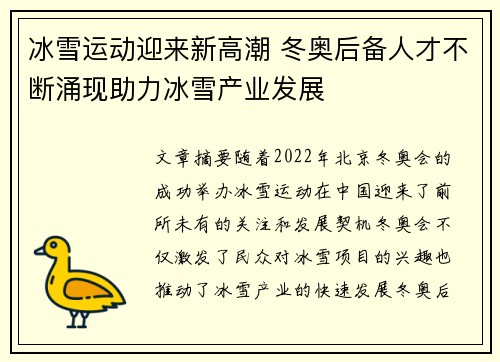 文章摘要:随着2022年北京冬奥会的成功举办,冰雪运动在中国迎来了前所未有的关注和发展契机。冬奥会不仅激发了民众对冰雪项目的兴趣,也推动了冰雪产业的快速发展。冬奥后备人才的培养和发展,成为推动冰雪运动...