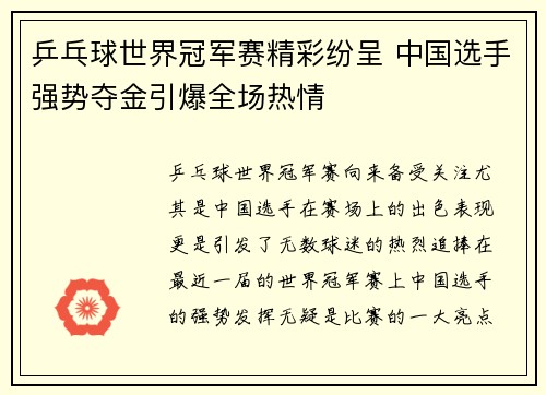 乒乓球世界冠军赛向来备受关注,尤其是中国选手在赛场上的出色表现,更是引发了无数球迷的热烈追捧。在最近一届的世界冠军赛上,中国选手的强势发挥无疑是比赛的一大亮点。无论是精湛的球技、过人的心理素质,还是无...
