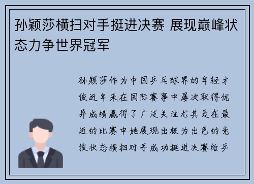 孙颖莎,作为中国乒乓球界的年轻才俊,近年来在国际赛事中屡次取得优异成绩,赢得了广泛关注。尤其是在最近的比赛中,她展现出极为出色的竞技状态,横扫对手成功挺进决赛,给乒乓球爱好者带来了新的期待与惊喜。孙颖...