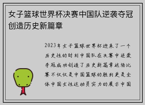 • 女子篮球世界杯决赛中国队逆袭夺冠创造历史新篇章