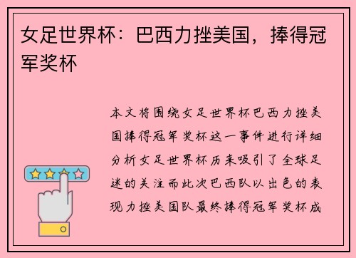 本文将围绕“女足世界杯:巴西力挫美国,捧得冠军奖杯”这一事件进行详细分析。女足世界杯历来吸引了全球足迷的关注,而此次巴西队以出色的表现力挫美国队,最终捧得冠军奖杯,成为了这届赛事的最大亮点。本篇文章将...