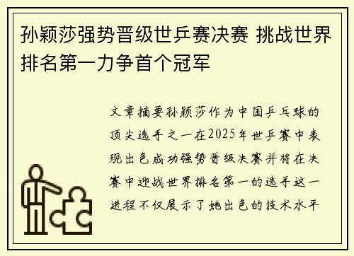 文章摘要:孙颖莎作为中国乒乓球的顶尖选手之一,在2025年世乒赛中表现出色,成功强势晋级决赛,并将在决赛中迎战世界排名第一的选手。这一进程不仅展示了她出色的技术水平和心理素质,还体现了她在国际大赛中不...