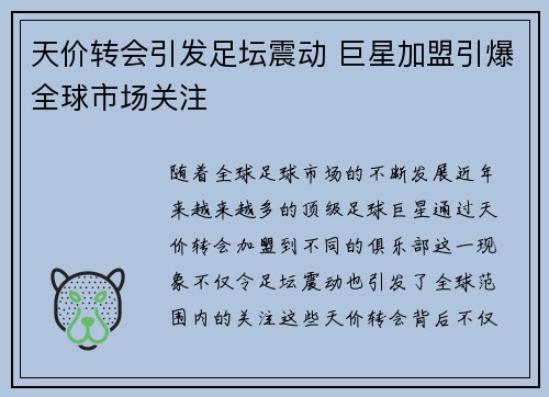 • 天价转会引发足坛震动 巨星加盟引爆全球市场关注