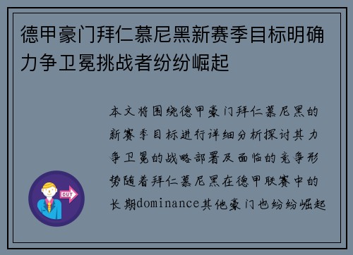本文将围绕德甲豪门拜仁慕尼黑的新赛季目标进行详细分析,探讨其力争卫冕的战略部署及面临的竞争形势。随着拜仁慕尼黑在德甲联赛中的长期 dominance,其他豪门也纷纷崛起,形成了强有力的挑战者。本文将从...