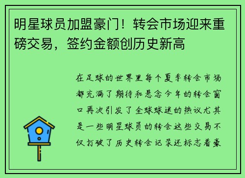 • 明星球员加盟豪门!转会市场迎来重磅交易,签约金额创历史新高