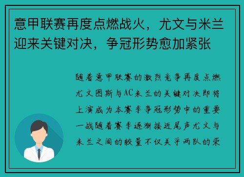 • 意甲联赛再度点燃战火,尤文与米兰迎来关键对决,争冠形势愈加紧张
