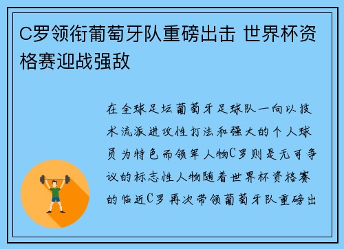 在全球足坛,葡萄牙足球队一向以技术流派、进攻性打法和强大的个人球员为特色,而领军人物C罗则是无可争议的标志性人物。随着世界杯资格赛的临近,C罗再次带领葡萄牙队重磅出击,力争在竞争激烈的欧洲区晋级赛事中...