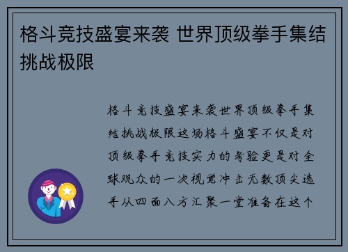 格斗竞技盛宴来袭,世界顶级拳手集结挑战极限。这场格斗盛宴不仅是对顶级拳手竞技实力的考验,更是对全球观众的一次视觉冲击。无数顶尖选手从四面八方汇聚一堂,准备在这个极限竞技的舞台上展开一场无与伦比的较量。...