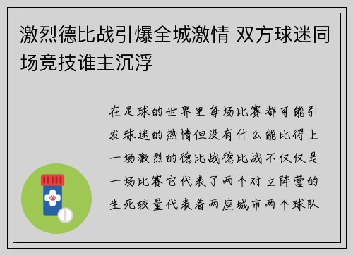 • 激烈德比战引爆全城激情 双方球迷同场竞技谁主沉浮