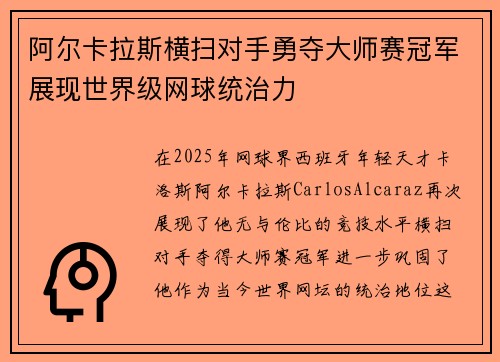 在2025年网球界,西班牙年轻天才卡洛斯·阿尔卡拉斯(Carlos Alcaraz)再次展现了他无与伦比的竞技水平,横扫对手夺得大师赛冠军,进一步巩固了他作为当今世界网坛的统治地位。这场比赛不仅仅是一...