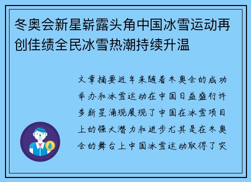 文章摘要:近年来,随着冬奥会的成功举办和冰雪运动在中国日益盛行,许多新星涌现,展现了中国在冰雪项目上的强大潜力和进步。尤其是在冬奥会的舞台上,中国冰雪运动取得了突破性成就,不仅在奖牌数量和种类上有所提...