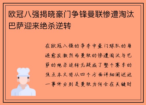 在欧冠八强的争夺中,豪门球队的角逐愈发激烈,而曼联的惨遭淘汰与巴萨的绝杀逆转无疑成了整个赛季的焦点。本文将从四个方面详细阐述这一事件,分别是曼联为何会在关键时刻失去机会,巴萨是如何在绝望中逆袭,欧冠八...