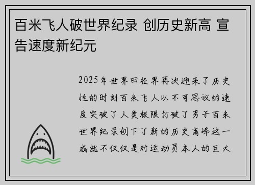 2025年,世界田径界再次迎来了历史性的时刻:百米飞人以不可思议的速度突破了人类极限,打破了男子百米世界纪录,创下了新的历史高峰。这一成就不仅仅是对运动员本人的巨大肯定,更是人类在追求速度与极限领域的...