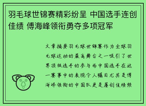文章摘要:羽毛球世锦赛作为全球羽毛球运动的最高舞台之一,吸引了世界顶级选手的参与,而中国选手在这一赛事中的表现令人瞩目。尤其是傅海峰领衔的中国队,更是屡创佳绩,频频夺冠,彰显了中国羽毛球强大的实力和不...