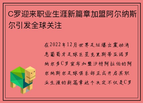 在2022年12月,世界足坛爆出震动消息,葡萄牙足球巨星克里斯蒂亚诺·罗纳尔多(C罗)宣布加盟沙特阿拉伯的阿尔纳斯尔足球俱乐部,正式开启其职业生涯的新篇章。这个决定不仅是C罗个人职业生涯的重大转折点,...