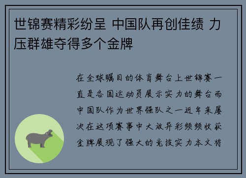 在全球瞩目的体育舞台上,世锦赛一直是各国运动员展示实力的舞台,而中国队作为世界强队之一,近年来屡次在这项赛事中大放异彩,频频收获金牌,展现了强大的竞技实力。本文将围绕“世锦赛精彩纷呈,中国队再创佳绩,...