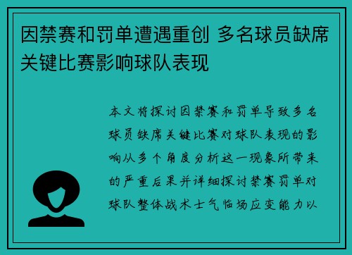 本文将探讨因禁赛和罚单导致多名球员缺席关键比赛对球队表现的影响。从多个角度分析这一现象所带来的严重后果,并详细探讨禁赛、罚单对球队整体战术、士气、临场应变能力以及球队长期发展等方面的深远影响。禁赛和罚...