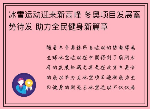 随着冬季奥林匹克运动的热潮席卷全球,冰雪运动在中国得到了前所未有的发展机遇,尤其是在北京冬奥会的成功举办后,冰雪项目逐渐成为全民健身的新亮点。冰雪运动不仅仅局限于竞技领域,它的普及和发展带动了各项冬季...