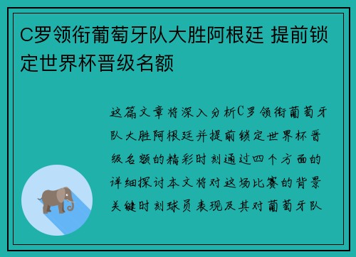 这篇文章将深入分析C罗领衔葡萄牙队大胜阿根廷并提前锁定世界杯晋级名额的精彩时刻。通过四个方面的详细探讨,本文将对这场比赛的背景、关键时刻、球员表现及其对葡萄牙队未来的影响进行全面剖析。首先,我们将回顾...