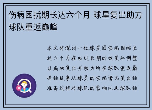 本文将探讨一位球星因伤病困扰长达六个月,在经过长期的恢复和调整后成功复出,并助力所在球队重返巅峰的故事。从球员的伤病情况、复出的准备过程、对球队的影响以及球队的整体表现四个方面进行详细分析。首先,我们...