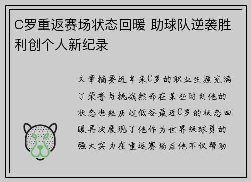 文章摘要:近年来,C罗的职业生涯充满了荣誉与挑战。然而,在某些时刻,他的状态也经历过低谷。最近,C罗的状态回暖,再次展现了他作为世界级球员的强大实力。在重返赛场后,他不仅帮助球队完成了艰难的逆袭,还创...