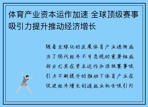 随着全球化的发展,体育产业逐渐成为了现代经济不可忽视的重要组成部分。尤其在资本运作和顶级赛事吸引力不断提升的推动下,体育产业在促进经济增长、创造就业机会、吸引外资等方面展现出强大的潜力。本文将从四个方...