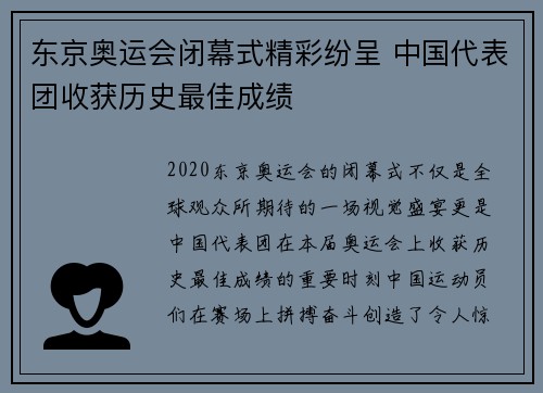 2020东京奥运会的闭幕式,不仅是全球观众所期待的一场视觉盛宴,更是中国代表团在本届奥运会上收获历史最佳成绩的重要时刻。中国运动员们在赛场上拼搏奋斗,创造了令人惊叹的成绩,尤其是在金牌数、奖牌总数以及...