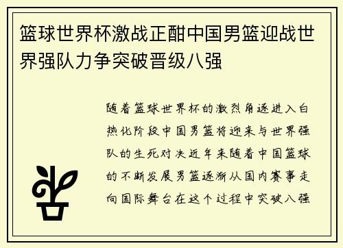 随着篮球世界杯的激烈角逐进入白热化阶段,中国男篮将迎来与世界强队的生死对决。近年来,随着中国篮球的不断发展,男篮逐渐从国内赛事走向国际舞台。在这个过程中,突破八强一直是中国男篮的奋斗目标之一。今年的篮...