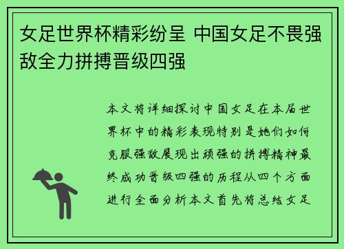 本文将详细探讨中国女足在本届世界杯中的精彩表现,特别是她们如何克服强敌,展现出顽强的拼搏精神,最终成功晋级四强的历程。从四个方面进行全面分析,本文首先将总结女足世界杯的赛况,接着深入探讨中国女足的战略...