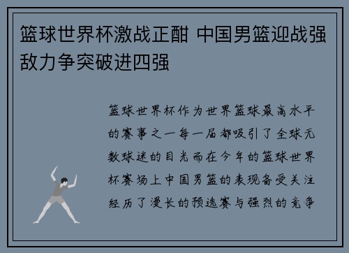 篮球世界杯作为世界篮球最高水平的赛事之一,每一届都吸引了全球无数球迷的目光。而在今年的篮球世界杯赛场上,中国男篮的表现备受关注。经历了漫长的预选赛与强烈的竞争后,中国男篮即将迎战强敌,全力以赴力争突破...