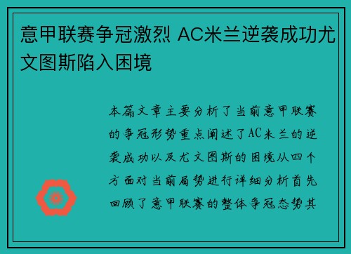 本篇文章主要分析了当前意甲联赛的争冠形势,重点阐述了AC米兰的逆袭成功以及尤文图斯的困境。从四个方面对当前局势进行详细分析:首先,回顾了意甲联赛的整体争冠态势;其次,重点探讨了AC米兰近年来的崛起及其...