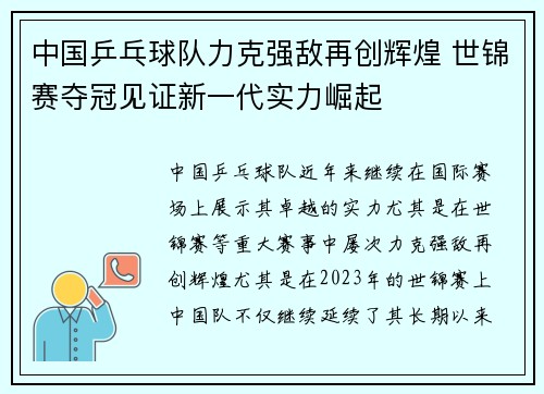 • 中国乒乓球队力克强敌再创辉煌 世锦赛夺冠见证新一代实力崛起