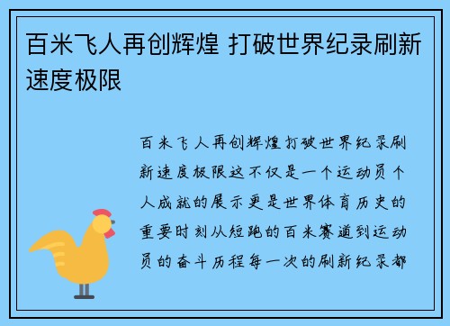 百米飞人再创辉煌,打破世界纪录,刷新速度极限,这不仅是一个运动员个人成就的展示,更是世界体育历史的重要时刻。从短跑的百米赛道到运动员的奋斗历程,每一次的刷新纪录,都凝聚着不为人知的努力和奋斗。本篇文章...