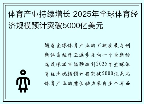 随着全球体育产业的不断发展与创新,体育经济正逐步走向一个全新的高度。根据市场预测,到2025年,全球体育经济规模预计将突破5000亿美元。体育产业的增长动力来自多个方面,包括观众需求的增加、体育赛事商...