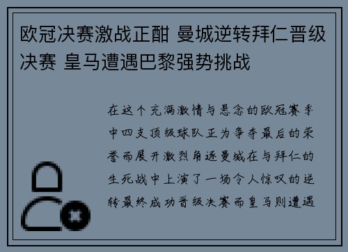 在这个充满激情与悬念的欧冠赛季中,四支顶级球队正为争夺最后的荣誉而展开激烈角逐。曼城在与拜仁的生死战中上演了一场令人惊叹的逆转,最终成功晋级决赛。而皇马则遭遇了巴黎圣日耳曼的强势挑战,这场对决充满了悬...