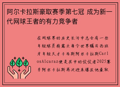 在网球界的历史长河中,总会有一些年轻球员崭露头角,令世界瞩目。西班牙年轻天才卡洛斯·阿尔卡拉斯(Carlos Alcaraz)便是其中的佼佼者。2025赛季,阿尔卡拉斯再次迎来爆发,他豪取了赛季第七个...